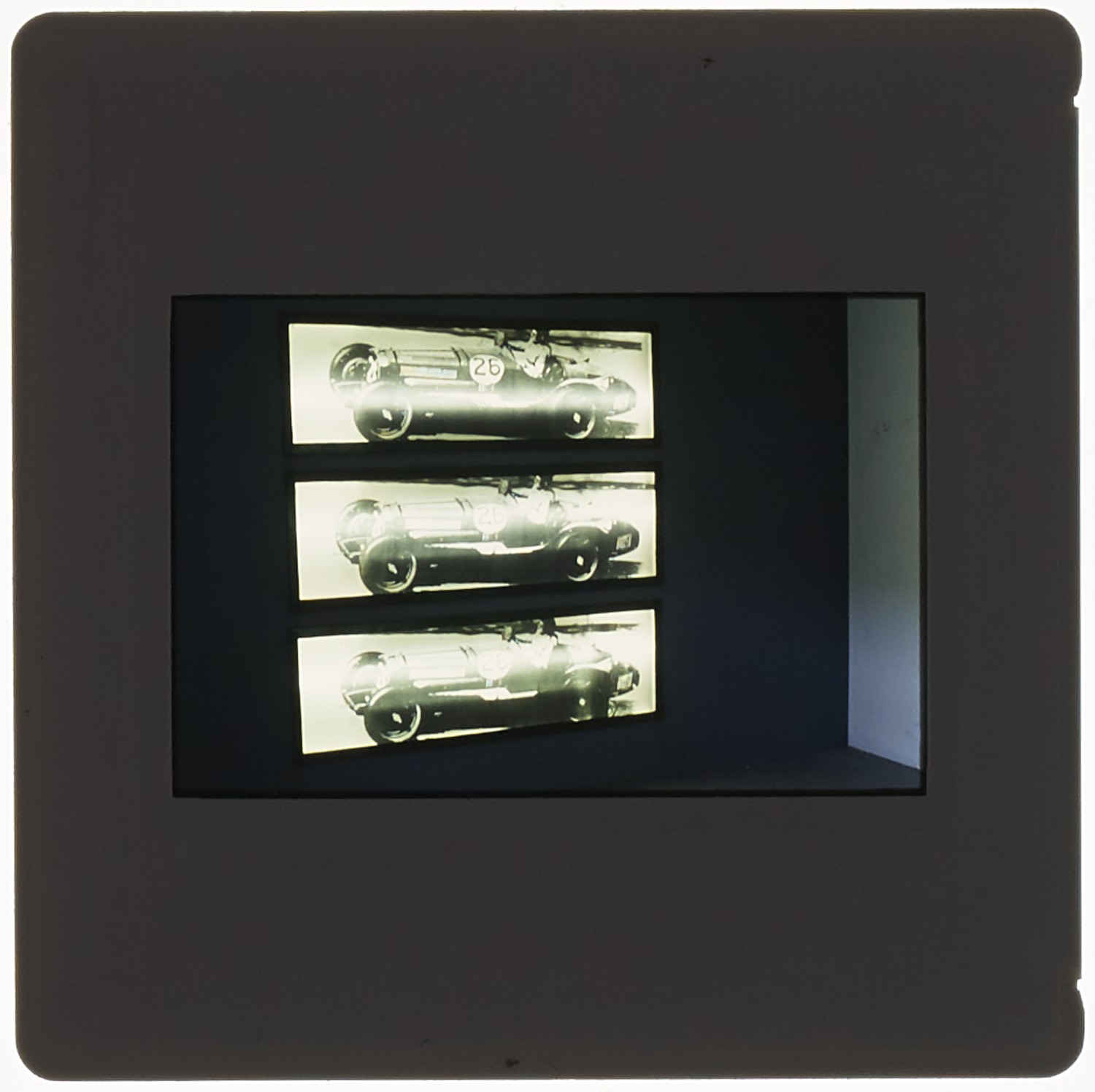 35mm colour slide of degree show installation of a life size model of the body of a car in white tones.