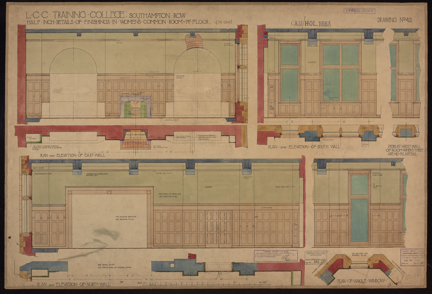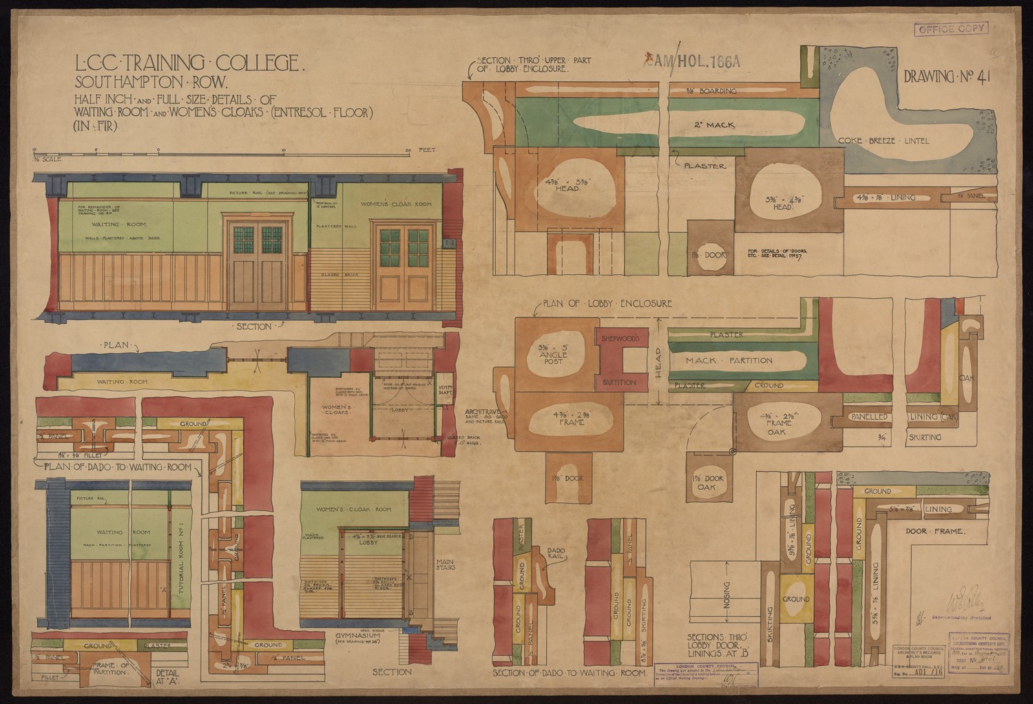 LCC Training College Southampton Row - Half Inch and Full Size Details of Waiting Room and Woman's Cloaks (Entresol Floor) -