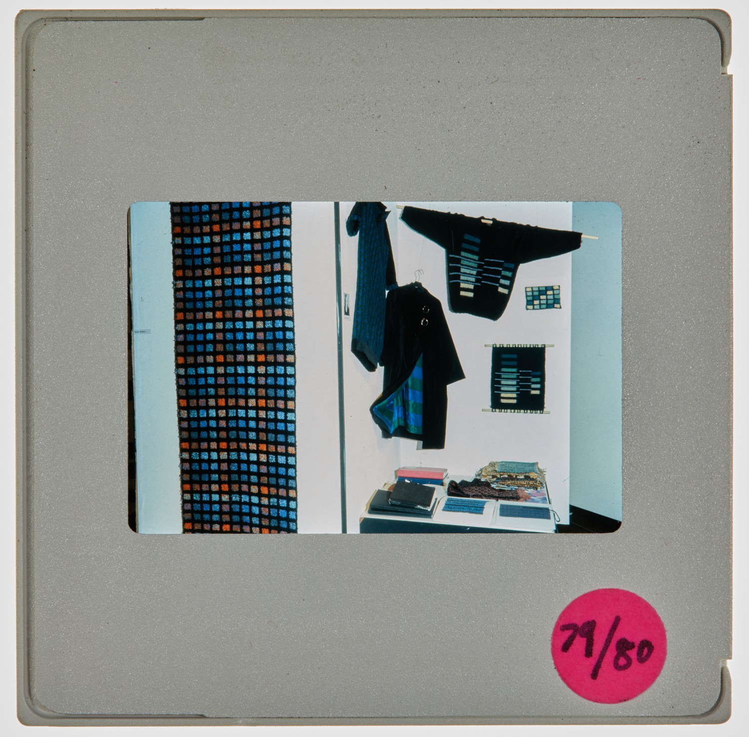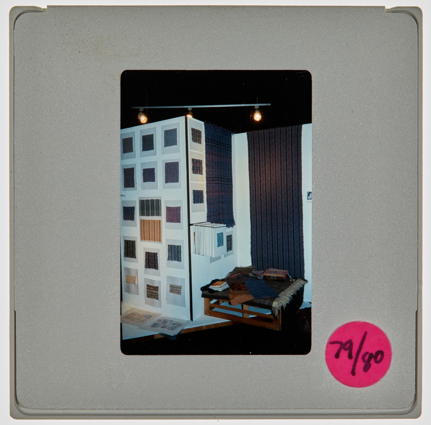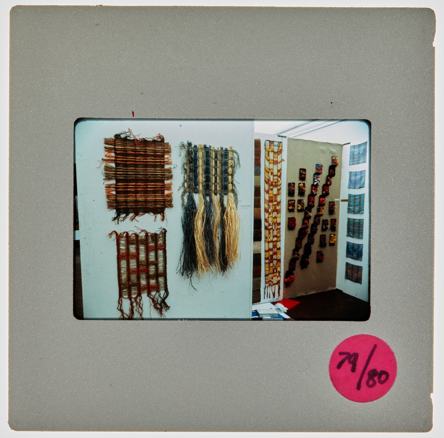 35mm colour slide of degree show installation of a number of fragments of fabric in varying patterns and tones.