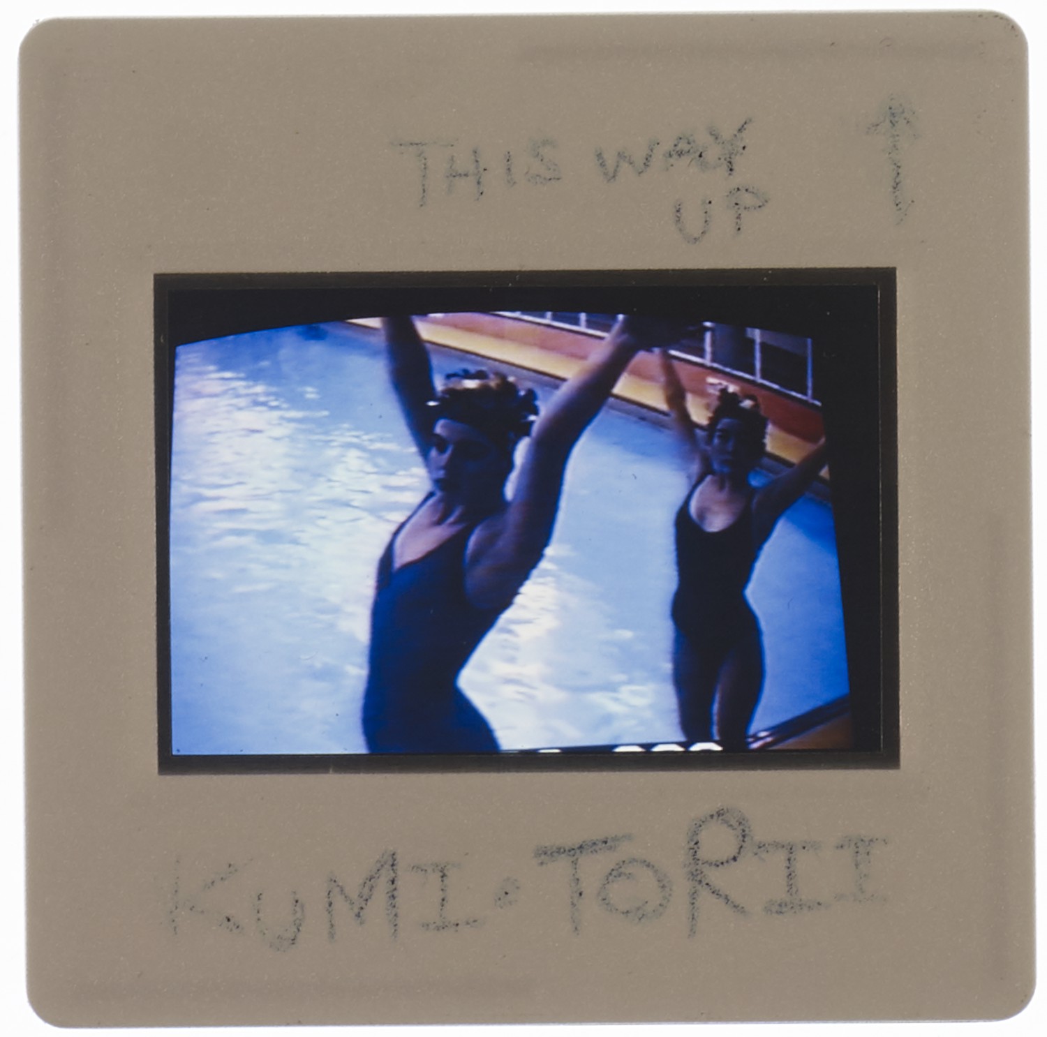 35mm colour slide of photograph of a woman wearing black in front of a black background.