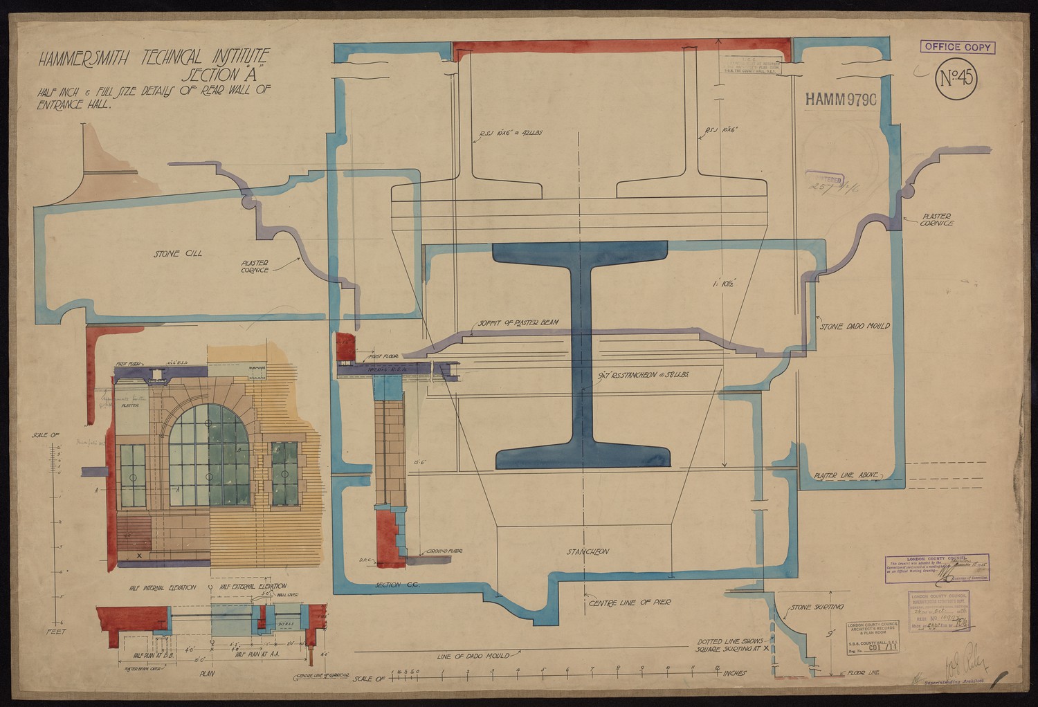 Hammersmith Technical Institute Section A - Half Inch and Full Size Details of Rear Wall of Entrance Hall -