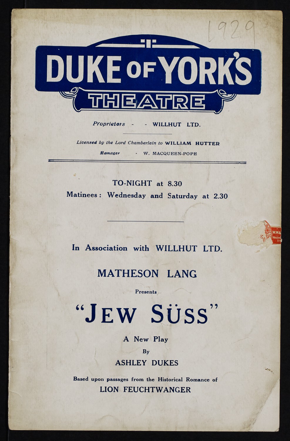 Jew Süss / - by Ashley Dukes ; produced by Matheson Lang and Reginald Denham. -