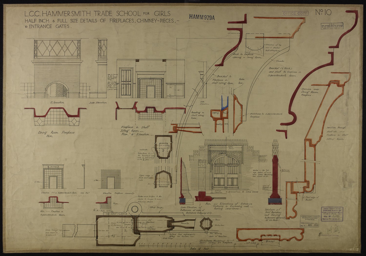 L.C.C. Hammersmith Trade School for Girls: Half Inch & Full Size Details of Fireplaces, Chimney-Pieces, & Entrance Gates -