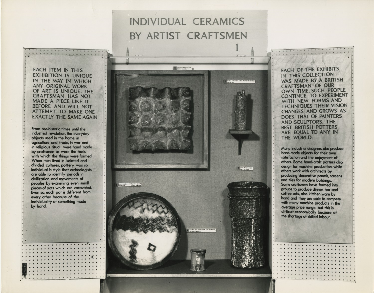 Black and white photographic print showing a single display case from the Circulating Design Scheme.
