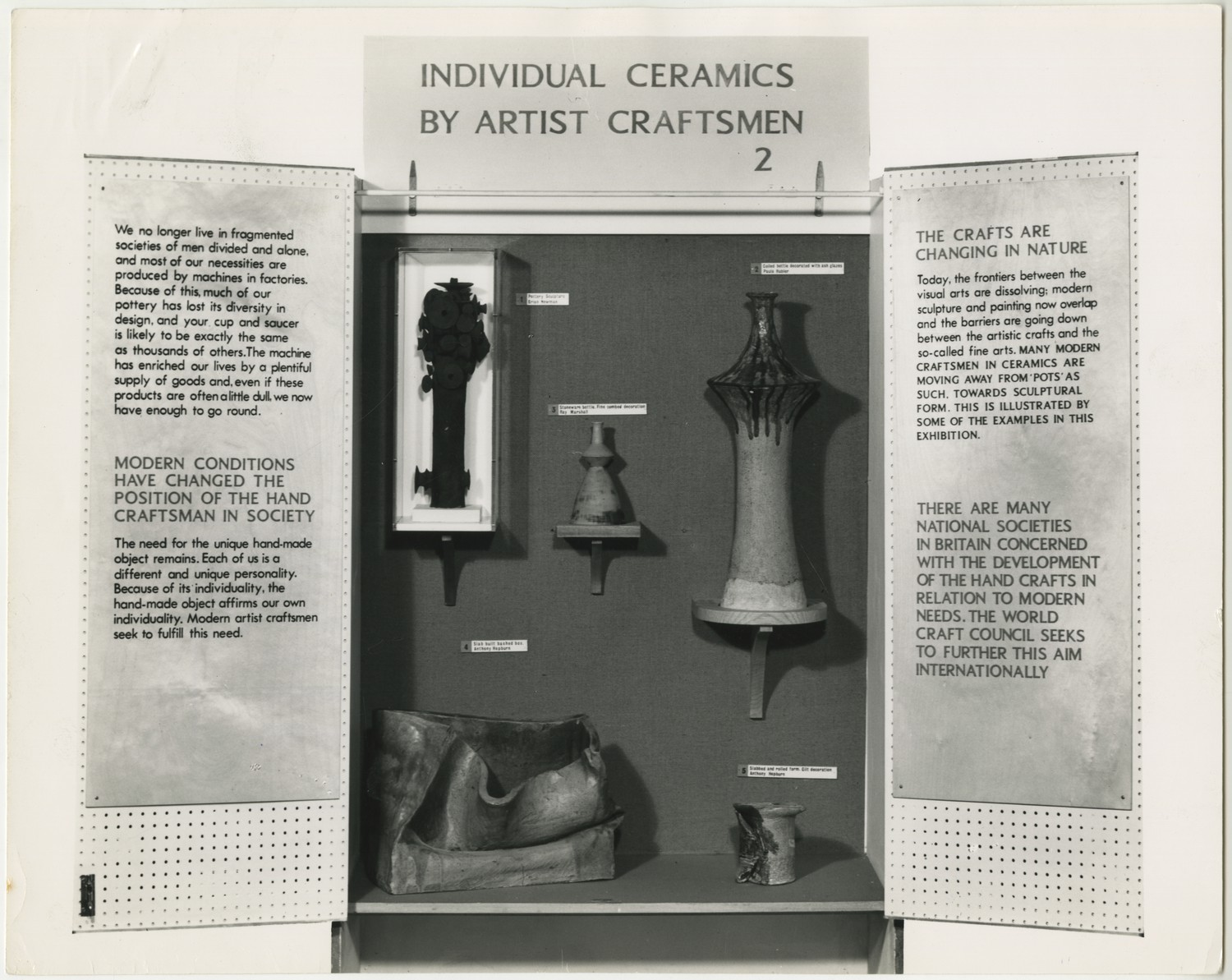 Black and white photographic print showing a single display case from the Circulating Design Scheme.