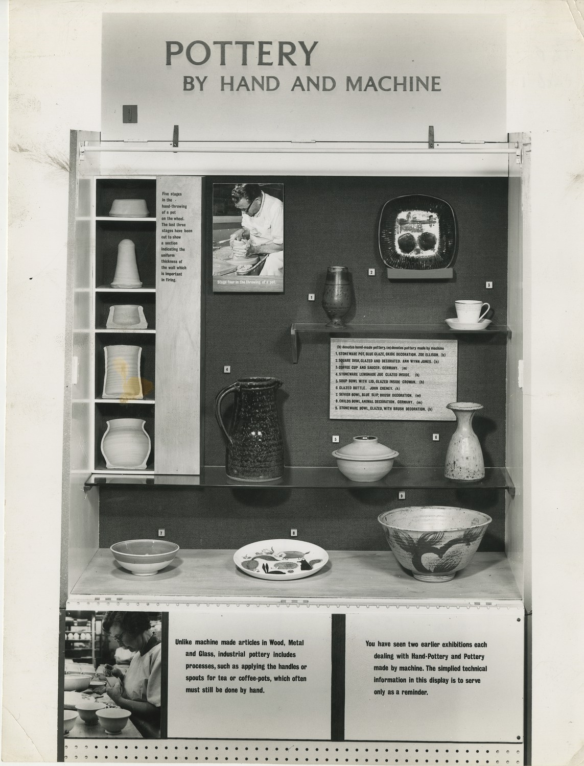 Black and white photographic print showing a single display case from the Circulating Design Scheme.