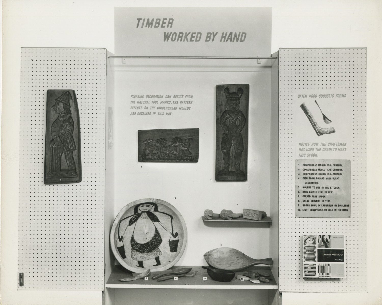 Black and white photographic print showing a single display case from the Circulating Design Scheme.