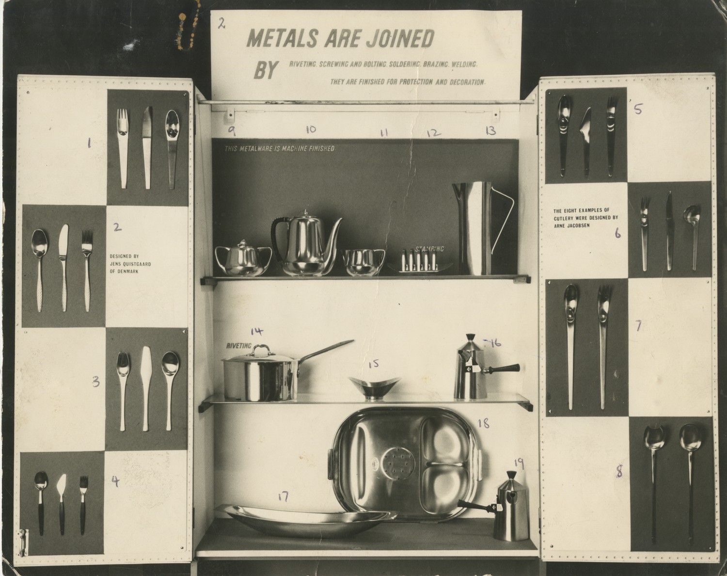 Black and white photographic print showing a single display case from the Circulating Design Scheme.